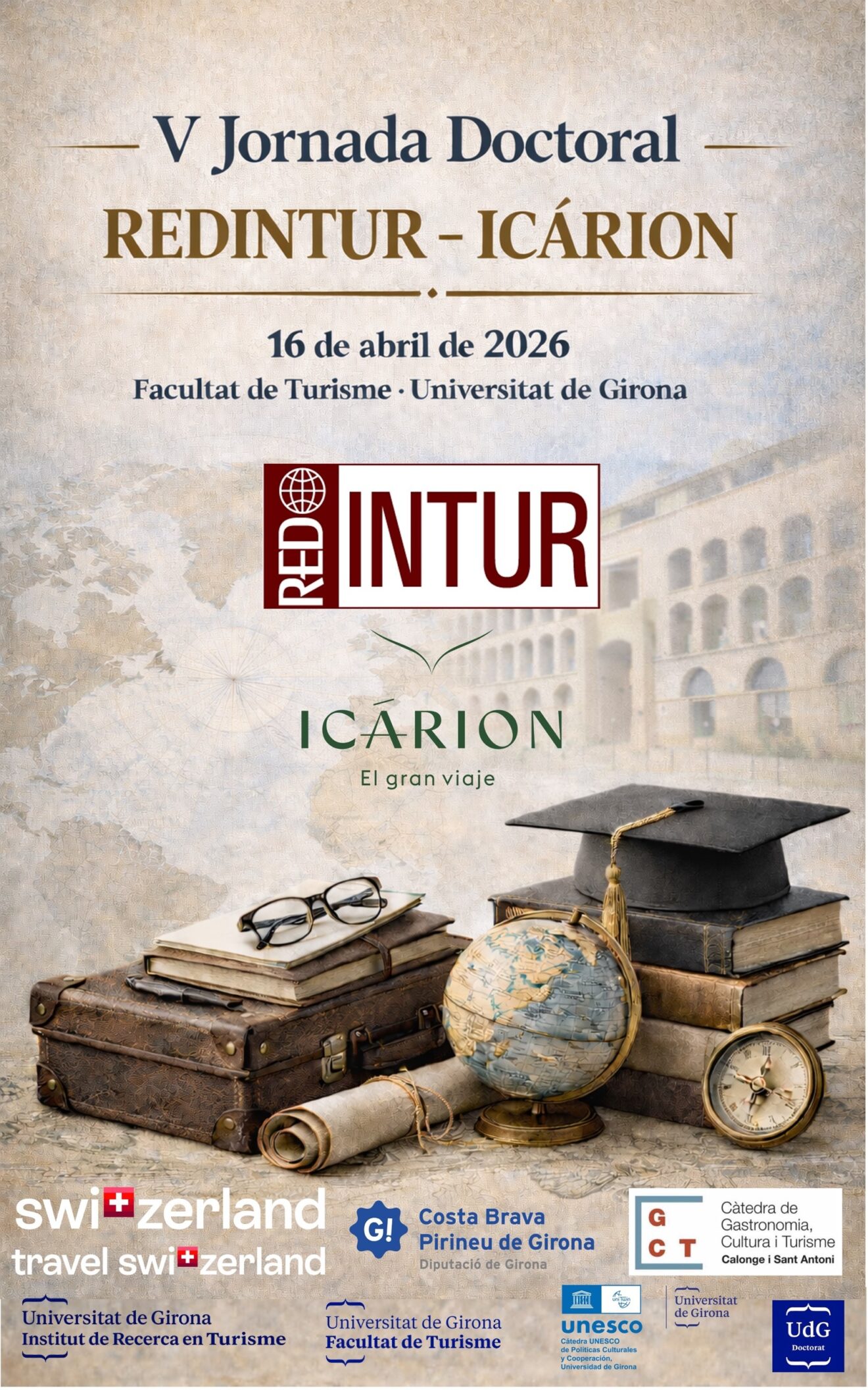 La Red Interuniversitaria de Posgrados en Turismo (REDINTUR) reafirma su compromiso con la investigación turística con la celebración de la V Jornada Doctoral REDINTUR – ICÁRION, que tendrá lugar el 16 de abril de 2026 en la Facultat de Turisme de la Universitat de Girona. Esta cita anual, organizada en colaboración con Icárion – El gran viaje, se consolida como un espacio de referencia para visibilizar el talento investigador, generar diálogo académico y favorecer la transferencia de conocimiento entre universidad y sector profesional.